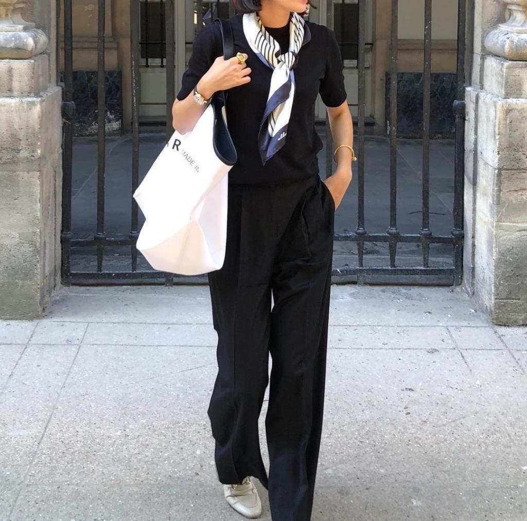 黑色西装裤也是如此,以极简干练修饰腿型的直筒版型取胜,同色系的一致性配合着裤中衍缝设计、共同延伸着腿部线条,达到显高显瘦的目的。但是所有的搭配亮点、远远不及颈部的丝巾所带来的清雅女人味深入人心,在沉稳大气的都市装扮中,丝巾散发出的阵阵柔情,是对女人魅力永恒的坚守。