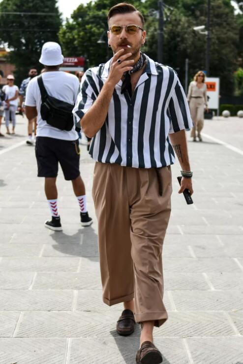 Compared with T-shirts, Short-sleeved shirts have more lines, so when paired with trousers, you need to choose a slightly looser version, but be careful not to be too wide, otherwise it will easily make you look thinner.