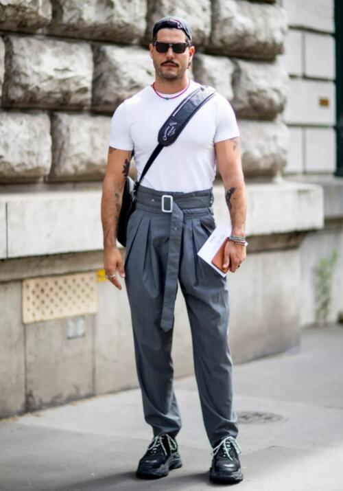 Also, for this case , you can also choose a pair of loose wide-leg pants, which can balance the proportion of the upper and lower bodies without making the shape abrupt due to the muscular upper body.
