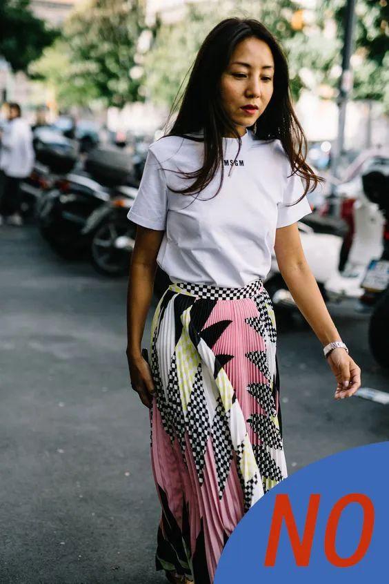 胸前印花越大,越容易显得壮,没有净版来的简洁大方。同理上身瘦的妹子,可以用胸口有印花的款式,来遮挡和起到膨胀作用。