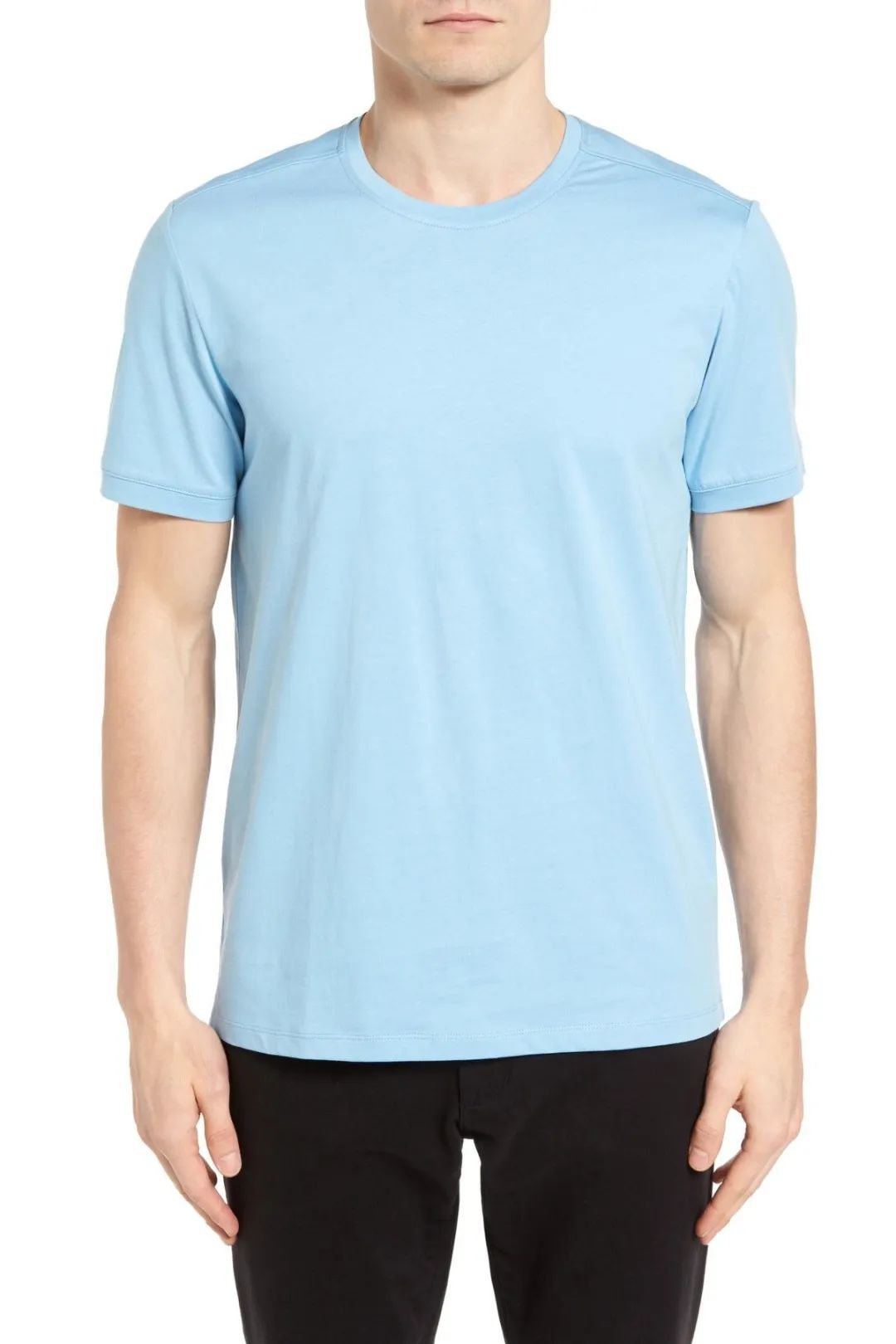 圆领是T恤里最经典的领型。但是我们在选择时,最好选择露出些微锁骨的圆型领口,也就是在锁骨和脖子交界处的位置,如果比这个再小容易吃脖子,显脸大。