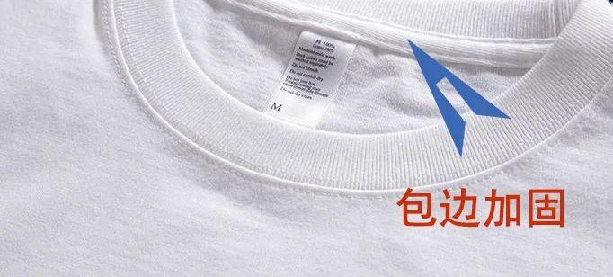 一定要选择这种领口紧凑、有一定硬度的织带,以及领口内侧箭头指向的地方,有包边和加固处理,这样的T恤领口才能经得起时间和搓洗,而不轻易变形。