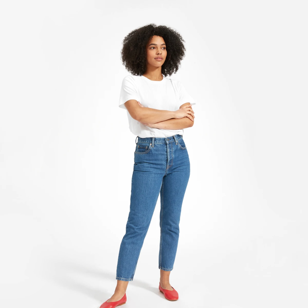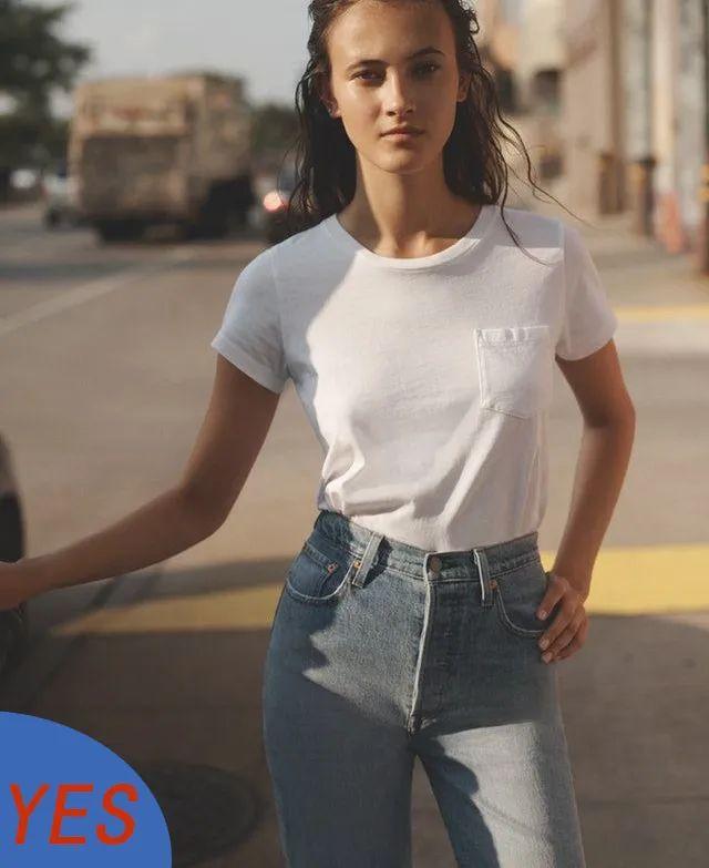 最经典最理想的T恤袖子,应该是在上臂二分之一长短的位置,这个位置基本可以包裹住任何手臂肉肉问题。另外喜欢手臂看起来细一点的,可以用宽袖口来对比。