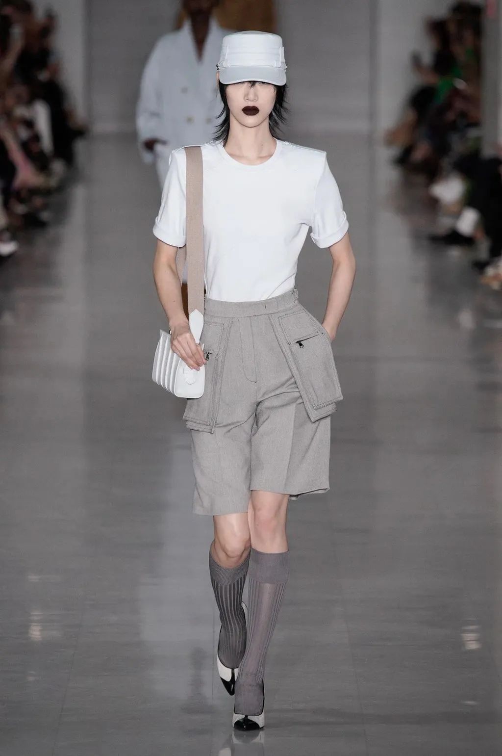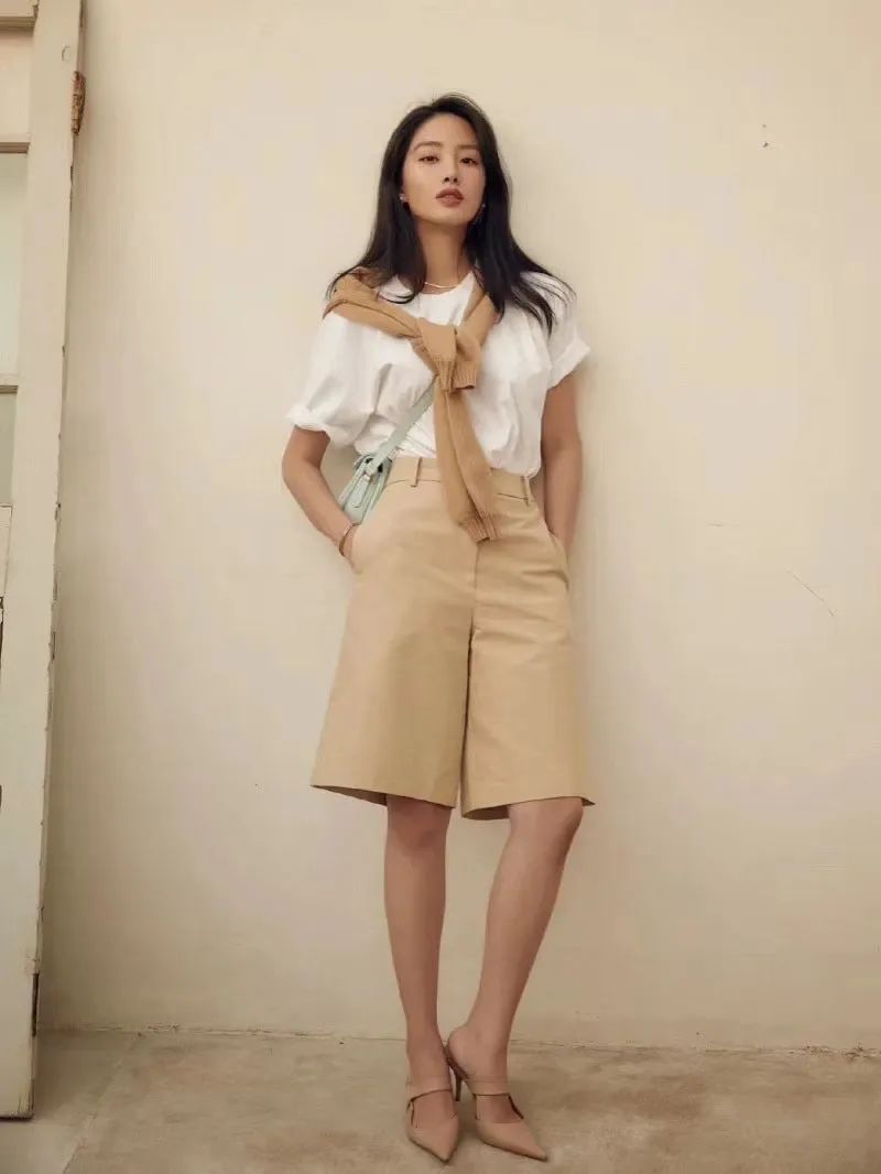 百慕大短裤,要比普通短裤多了一些知性文雅的稳妥气息,同时用白色T恤提升中裤的职场属性,这一组看来,既率性飒气,又利落果敢。