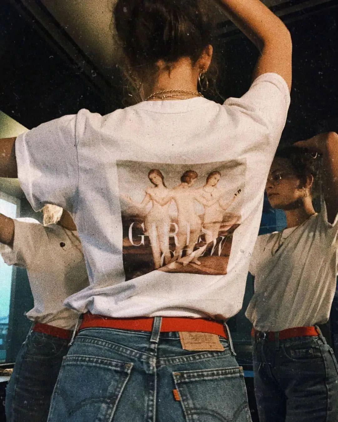 好的印花可以给小白T锦上添花的效果,特别是一些短小、精致、黑色字母风格的印染,无端带着一股高级属性。