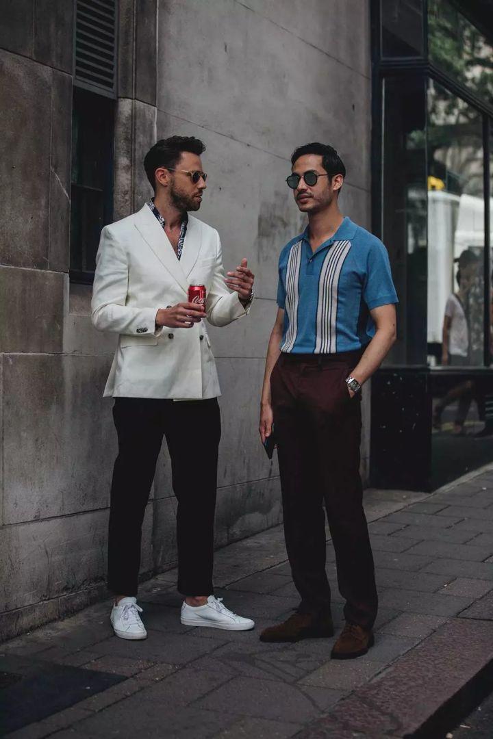 In casual style, both top and bottom clothing can be replaced with more colors and designs, ideas Still the same. The color combination of the lake blue POLO shirt and burgundy trousers inspires the aristocratic character of the POLO shirt. (This is a street photo taken outside the fashion week. It shows that the most fashionable men in the world are also making changes and innovations in traditional matching.)