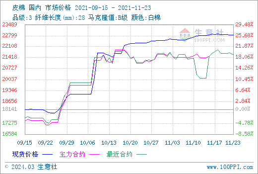Price: According to data from SunSirs, the price of 3128B lint cotton on the 23rd was 22,839 yuan/ton, an increase of 2.17% from the previous month.