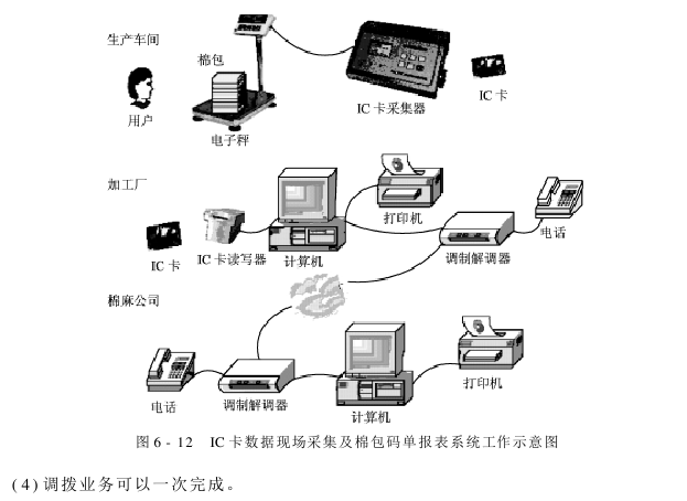 The basic composition of this reporting system is mainly divided into two parts: the finishing plant and the cotton and linen company (cotton and linen station). The finishing plant part includes an IC card data collector placed in the workshop and directly connected to the electronic scale and a computer running the code order report program placed in the cotton inspection room. The cotton and linen company part is mainly a computer running a remote reporting program. The two parts realize remote data transmission through the telephone network, and its working diagram is shown in Figure 6-12.