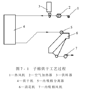 Zi Mian It is transported by the external suction pneumatic conveying device, enters the sub-cotton automatic control box, and is evenly fed into the hot air duct at the bottom of the sub-cotton automatic control box by the feeder (air closing valve). The hot air sent from the air heating system mixes with the cotton here and sends the cotton into the dryer. In the dryer, the sub-cotton and hot air exchange heat, and the moisture in the sub-cotton is fully evaporated and absorbed by the hot air. After the cotton leaves the dryer with the hot air, it is sent to the internal suction cotton separator. The internal suction cotton separator separates the hot air and sub-cotton. The dried sub-cotton can be processed in the next process, while the hot and humid air is discharged into the atmosphere after dust removal.