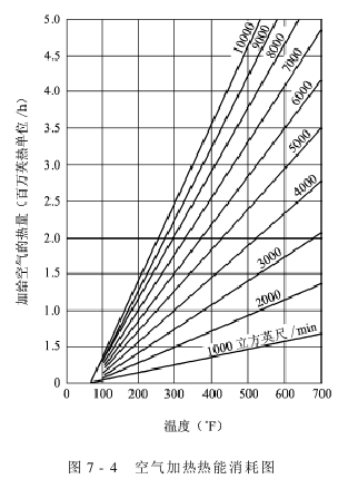 For example, if it is required to heat 15300m3 of air per hour (about 9000 cubic feet/min), the temperature of the heated air is 121℃ (about 250u). Looking at Figure 7-4, we can see that the consumption per hour The thermal energy is approximately 184.5MJ (approximately 1,750,000 British thermal units).