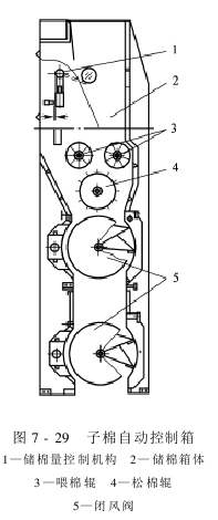 The automatic control box for sub-cotton plays the role of storing sub-cotton and regulating the flow of sub-cotton in the process. Its structure is shown in Figure 7-29. It mainly consists of a cotton storage box, It consists of 1 pair of cotton feeding rollers, cotton loosening rollers and 2 air closing valves. Its main process performance includes the following aspects.