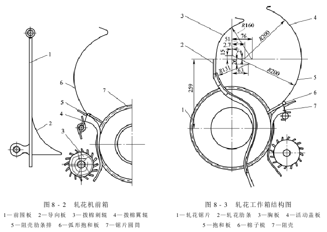 The middle box, also called the ginning working box, is the main part of the sawtooth gin. Its function is to separate cotton fibers and cotton seeds. The embossed working box is composed of shell rib rows, holding plates, movable cover plates, breast plates and embossed rib rows, as shown in Figure 8-3. The cross-section of the work box is a geometric shape with a flat, round upper part and a slightly drooping peach shape. There are wall panels on both sides. The lower end of the holding board is equipped with a cotton comb, and the saw blade extends into the work box from the gap between the embossed ribs.