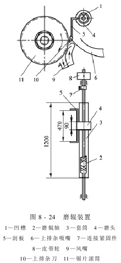 There are often insect feces and insect corpses stuck to the cutting edge of the upper row. They will stick to fibers and infertile eggs. When they accumulate to a certain extent, they will form many cotton slivers hanging on the cutting edge and suspended between the saw blades. . They may be caught by the saw teeth and remixed into the lint, affecting the quality of the lint. They may also interfere with the airflow direction of the air flushing port when the airflow is brushing, causing disordered airflow patterns, poor lint brushing, and increased lint loss. For this reason, the debris adhering to the upper debris discharge knife edge should be brushed off in time to keep the upper debris discharge knife edge clean. Nowadays, a grinding roller or a scraping roller device is generally used to clean the upper debris discharge blade. Figure 8-24 shows the grinding roller device. There are two spiral grooves with opposite rotation directions on the grinding roller shaft. The grinding head is embedded in the spiral groove using the fork angle, and two scrapers are installed on the grinding head. When the grinding head reciprocates on the shaft with the rotation of the grinding roller shaft, the scraper can scrape off the impurities adhered to the upper blade edge. The entire working process of the scraper should meet the length of the upper blade. To prevent impurities from embedding in the spiral groove, cloth covers should be placed on both sides of the grinding head. The scraper roller relies on the rotation of the scraper roller, and the elastic blade scrapes the impurities adhered to the upper scraper blade.