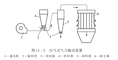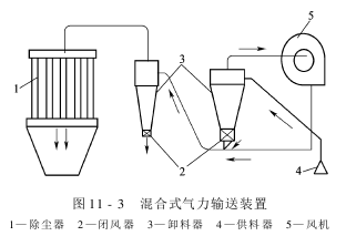 The hybrid pneumatic conveying device transports materials in both the suction pipe section and the pressure pipe section of the fan, that is, it is a combination of suction type and pressure feeding type, as shown in Figure 11-3 shown.