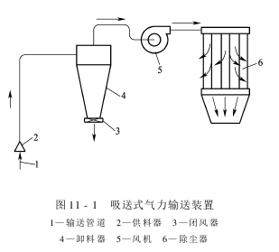 The suction type pneumatic conveying device uses a ventilator to suck air and materials into the conveying pipe and transport them to the discharge location. It is often used for material transportation inside the workshop, as shown in Figure 11-1.