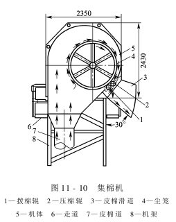 The cotton collector is mainly composed of a dust cage, a cotton pressing roller, a cotton picking roller, a cotton inlet, an air outlet and a cover, as shown in Figure 11-10.