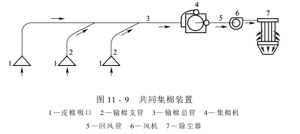 The common lint collection device mainly uses airflow to combine the lint produced by multiple gins and sends it to the main lint collection box. It is also a relatively typical suction type pneumatic conveying device. It mainly consists of lint suction nozzles, cotton transport branch pipes, It consists of cotton main pipe, cotton collecting machine, return air duct, fan, dust collector and other components, as shown in Figure 11-9.