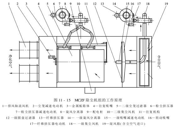 The process of MCZF dust removal system is shown in Figure 11-14, and the working principle of MCZF dust removal unit is shown in Figure 11-15.