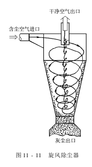 Cyclone dust collector (Figure 11-11), also known as Shakron, is made of tinplate and its structure consists of a cylinder, a cone, an exhaust pipe, an air inlet and an ash hopper . The cylinder, cone, discharge pipe and ash discharge port are located on the same axis. It uses the inertial centrifugal force acting on the dust particles to separate the dust from the gas when the dust-containing airflow rotates. When the dust-containing air enters tangentially along the downward spiral inlet at a high speed, it flows between the inner and outer cylinders. During the top-down spiral rotation, larger dust particles are thrown to the inner wall of the cylinder under the action of centrifugal force, where they rub and collide with the wall and lose speed. Under the action of gravity and top-down airflow, , fall to the bottom and be discharged from the ash hopper. The purified air gradually moves closer to the center of the cone as the cone part shrinks. When it is close to the bottom, it is blocked by the bottom and rotates upward to form a rewinding airflow, which is then discharged from the exhaust pipe.