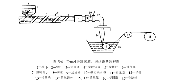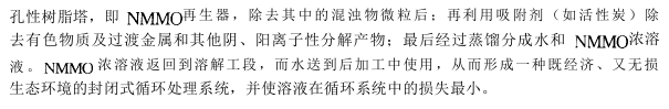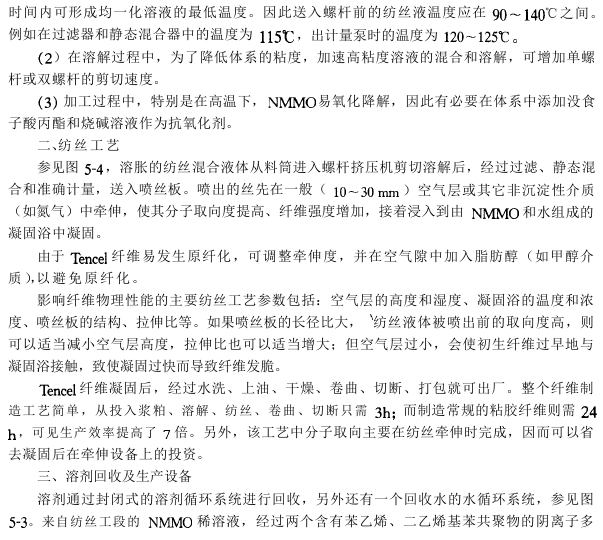 Compared with the production process of viscose fiber, the production process of Tencel fiber does not require chemical reaction, and the cellulose molecules avoid degradation caused by chemical reaction. This process is as follows: first, the wood pulp is dissolved in the NMMO solvent, and impurities are removed and filtered; then the dry-jet wet spinning process is used for spinning; then the silk is washed, dried, curled and cut, and at the same time, almost 100% NMMO is The solvent is recovered and reused. The process flow is shown in Figure 5-3.
