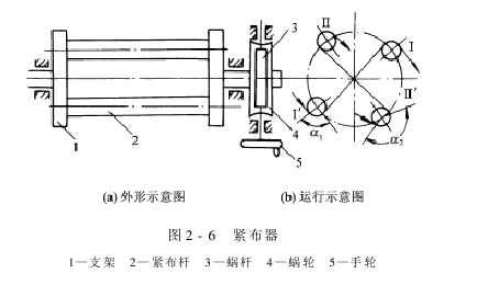 (2) Adjustment mechanism: It consists of a set of worm gears and worms. The worm gear is fixed on the support mandrel, and the worm is connected to the handwheel. When the operator turns the handwheel, the worm gear is driven by the worm, causing the support connected to the worm gear to rotate. In this way, the relative positions of the two fabric tightening rods fixed on the bracket also change, that is, the wrapping angle of the fabric on the fabric tightening rod is changed to achieve the purpose of adjusting the fabric tension.