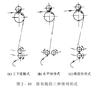 ①Up and down contact type: two doffing rollers are arranged vertically, as shown in Figure 2-10(a). The drop cloth roller is a driving roller, and the upper drop cloth roller is vertically pressed on the drop cloth roller due to its own weight, and rotates due to contact friction with the surface of the drop cloth drop roller. This type of drop roller is inconvenient during cloth threading operation and is prone to damage on dark-colored dry fabrics. It is also not suitable for embossed fabrics and light fabrics.