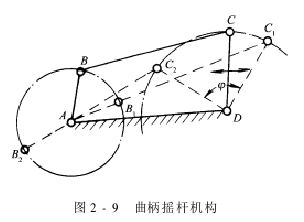 The crank-rocker mechanism is shown in Figure 2-9. It is composed of four components connected to each other by hinges. Among them, the AD component is fixed and is called a rack. The AB component is connected to the frame and can rotate in a circle, which is called a crank. The CD component is also connected to the frame, but it can only swing at a certain angle φ, which is called a rocker. When the crank AB makes a circular motion, the rocker CD swings back and forth at a certain angle φ. When crank AB and connecting rod BC are in line, the rocker is at the extreme position of its swing. In the figure, C1 is the right extreme position, and C2 is the left extreme position. It must be pointed out here that it must work when AB is smaller than CD.