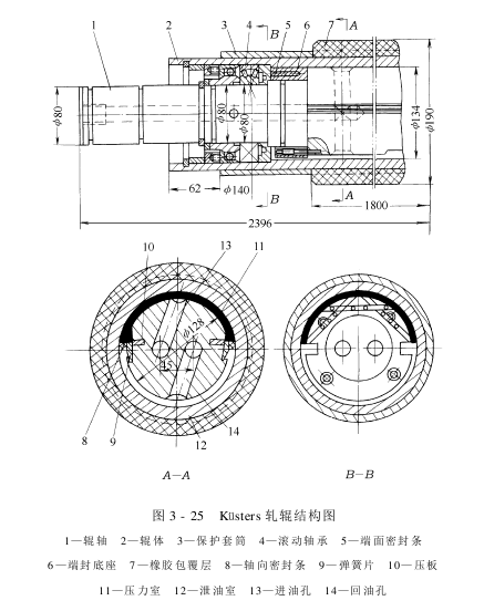 Figure 3-25 is the structural diagram of the German Küsters roll. The roller body is installed on the bearing and rotates around the fixed roller shaft. The cavity between the roller shaft and the roller body is divided into two chambers by the end sealing strip and the axial sealing strip. The semi-annular cavity on one side of the rolling point is called the pressure chamber; the semi-annular cavity on the other side of the rolling point is called the drain chamber. Pressure oil enters the pressure chamber through the oil inlet hole on the shaft end. The oil that leaks into the oil drain chamber flows back to the oil tank through the oil return hole on the shaft.