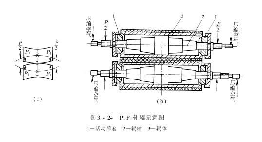 The P.F. roller shown in Figure 3-24 is made in Japan. The upper and lower rollers have the same structure. A pair of medium-solid rollers bends and deforms after being pressurized, resulting in a situation where the linear pressure is large in the middle and small at both ends, as shown in Figure 3-24(a). An additional pressure device is installed inside each end of the roller body, as shown in Figure 3-24(b). It consists of a tapered sleeve installed in the inner holes at both ends of the roller body and a tapered block that can slide axially on the roller shaft. The compressed air introduced from the center hole of the roller shaft head can make the tapered push block move axially into the roller body. The tapered surface presses against the inner surface of the tapered sleeve to generate a lateral additional pressure, which changes the deformation of the end of the roller body. By adjusting the pressure of compressed air, the additional pressure for lateral correction of deformation can be adjusted to suit the rolling pressure. The taper of the tapered push block and sleeve cannot be large, otherwise, the lateral correction will be small; but it cannot be too small, because self-locking occurs, generally about 10°.